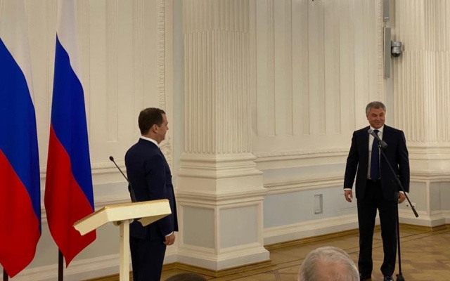 В присутствии Председателя Государственной Думы Вячеслава Володина благодарность Правительства РФ вручил заместитель Председателя Совета безопасности РФ Дмитрий Медведев.